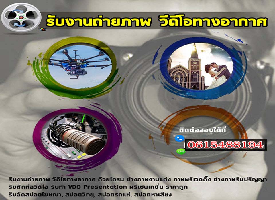 รับงานถ่ายภาพวีดีโอทางอากาศรับผลิตคลิปวีดีโอทุกรูปแบบ หนังสั้น โฆษณาสินค้า MusicVideo หรือแม้แต่รีวิวสินค้า ถ่ายภาพงานแต่งงาน